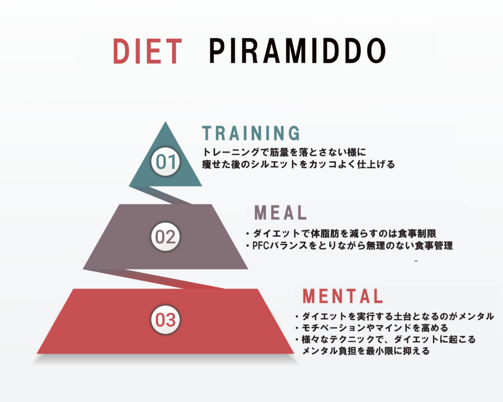 MMTのロゴにも使用されている、ダイエットピラミッドは、土台がメンタル、二段目に食事、最上部がトレーニングとなっています。土台のメンタルがしっかりと上の二段を支えなくては、ピラミッドは簡単に崩れてしまいます。それだけメンタルが重要であると考えております。